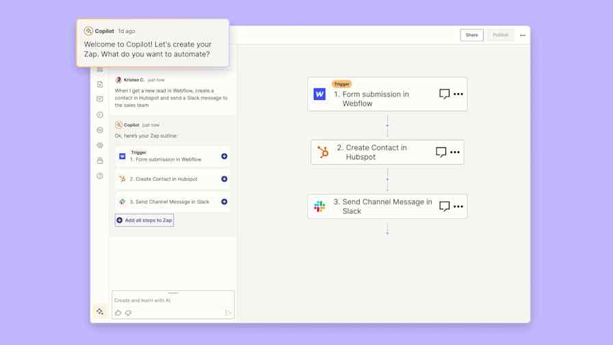 If you've created an automated workflow with Zapier before, creating a Zap with Interfaces will be the same. You can create a Zap from scratch with our point-and-click editor or create a Zap from within an interface.